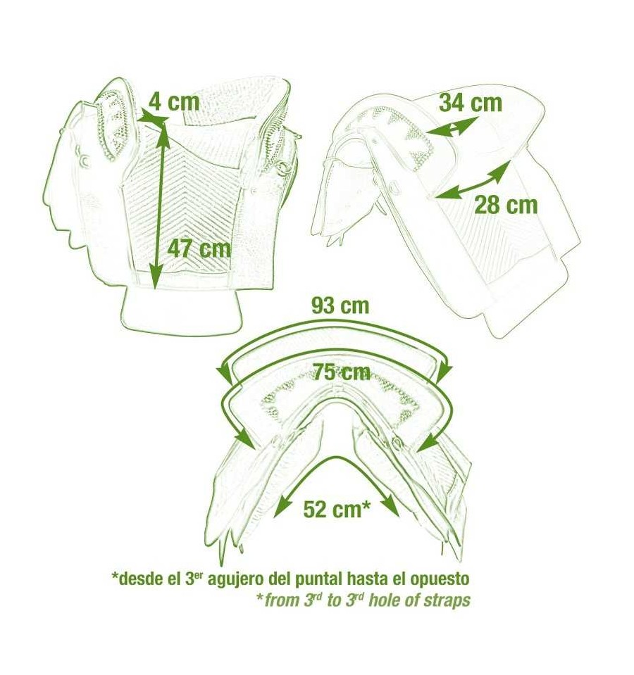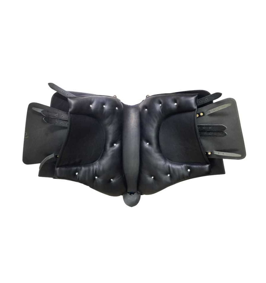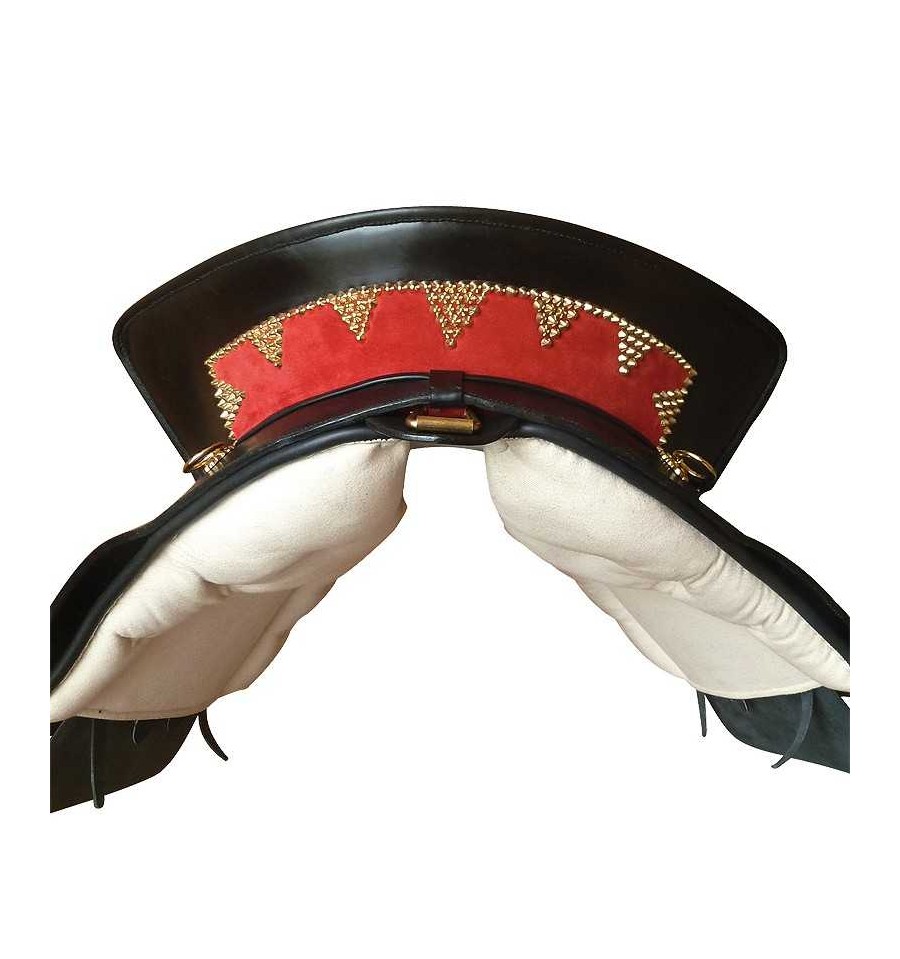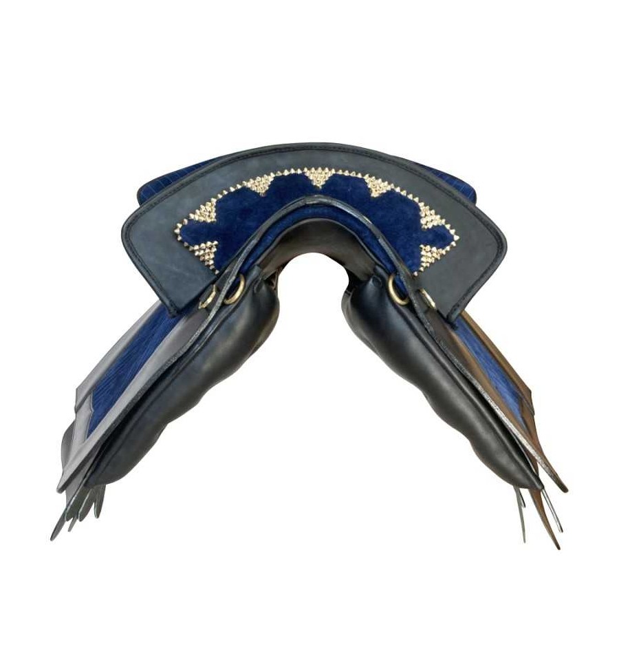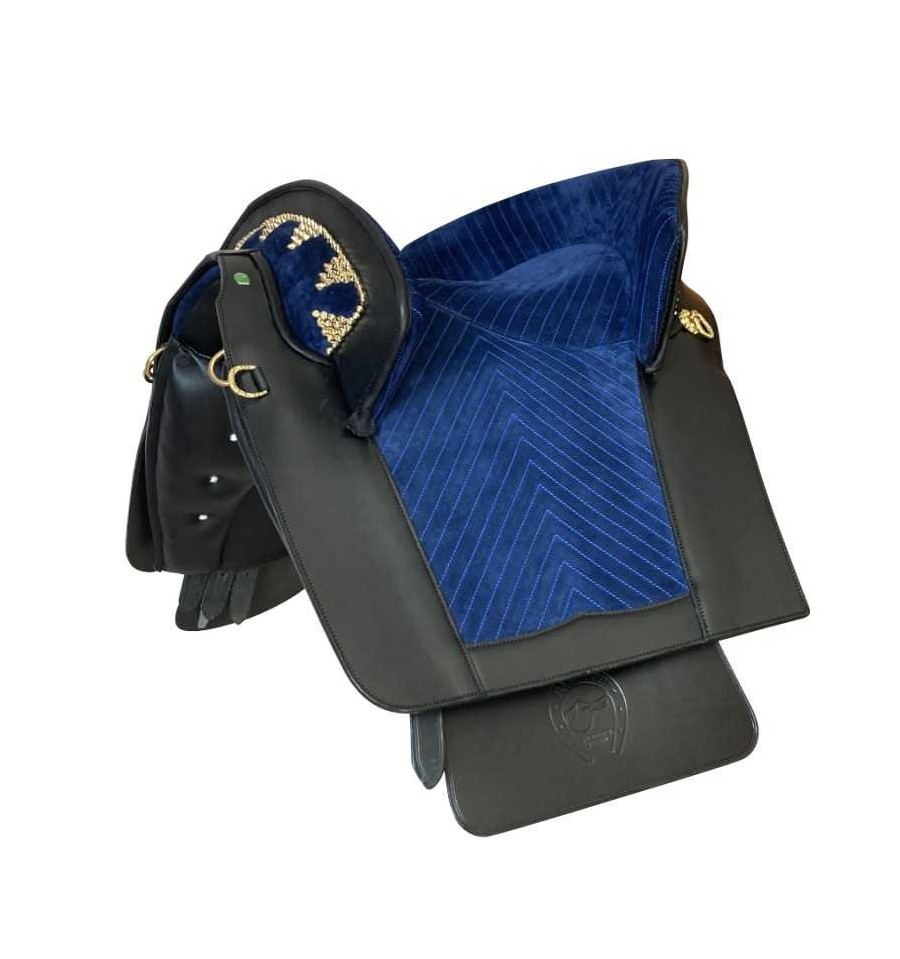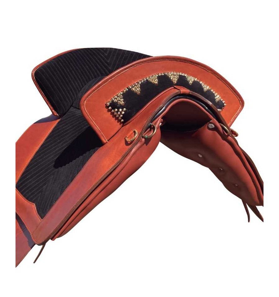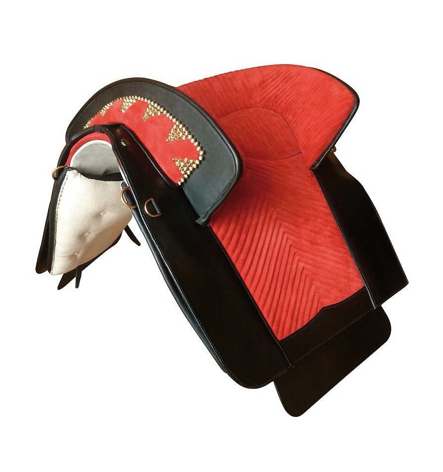 Montura portuguesa clásica hecha a mano, silla de montar a caballo con faldones de cuero y ante. Puedes elegir el color de cuero marrón, negro, avellana, blanco y el color del asiento rojo, negro, morado... Consultar colores. No olvides elegir entre las hebillas doradas o plateadas